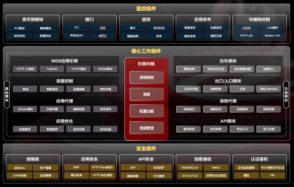 OpenNJet应用引擎是面向互联网和云原生应用提供的运行时组态服务程序。具备环境感知、安全控制、加速优化等能力,可利用动态加载机制实现不同的产品形态,如API网关、消息代理、入口/出口控制器、边车、负载均衡和WAF等。